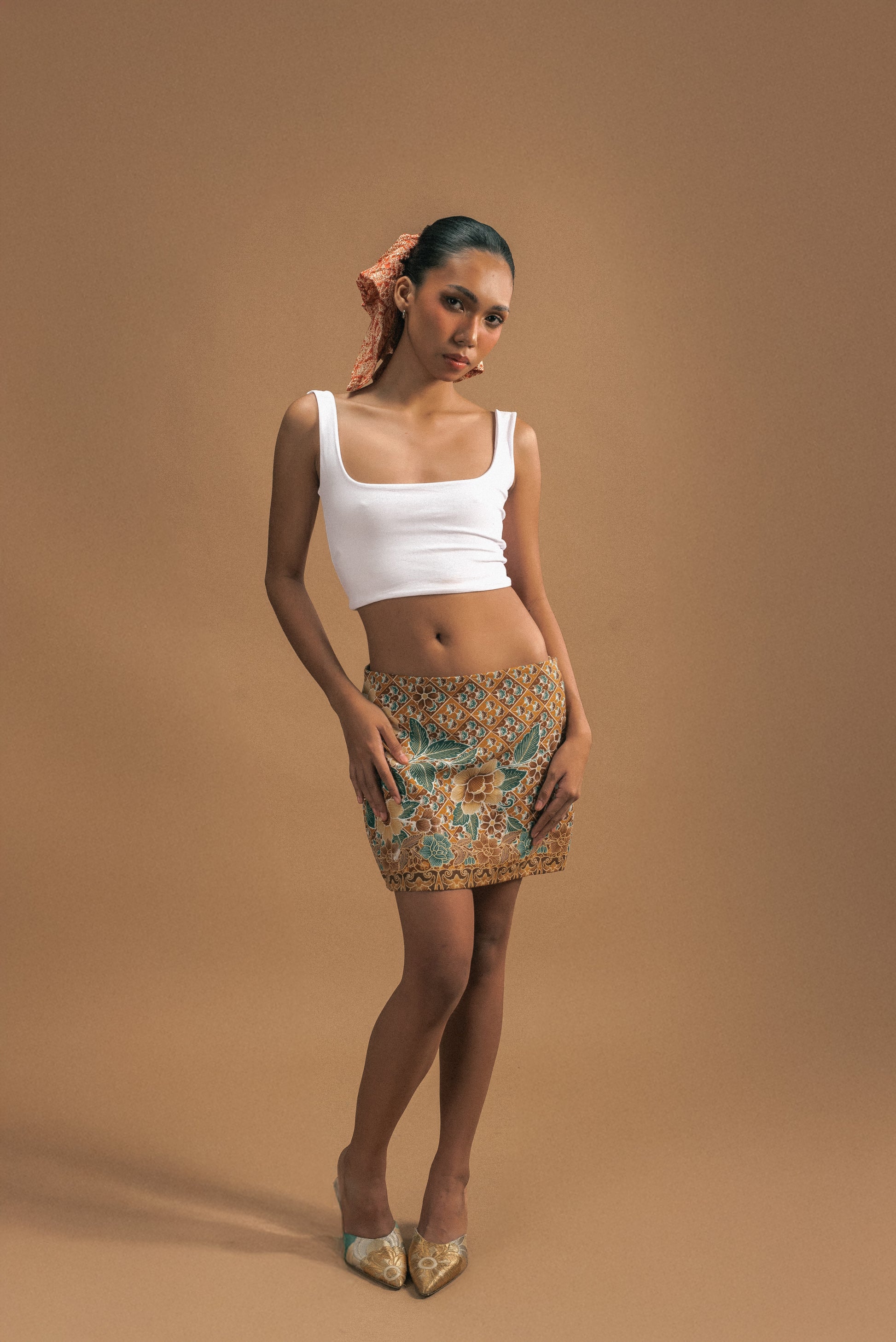 Crafted from 100% cotton fabric sourced from Bali, this mini skirt features earthy brown tones paired with soft greens and floral patterns. Lightweight, breathable, and effortlessly chic — perfect for warm days, casual outings, or resort-inspired styling.
